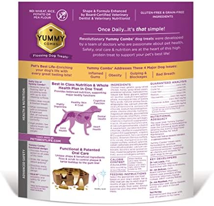 DENTAL TREATS THAT PROVIDE REAL DENTAL CARE – Yummy Combs, daily canine care for teeth, are easy to chew but work like dental floss for a more complete clean than a toothbrush or other chews. Its hardness helps scrub & clean more thoroughly than traditional dental dog treats or dental sticks. See the impact one treat a day can make for your dogโs oral care. Not only will your dog love the yummy flavor but also the feeling of a clean mouth & fresh breath (like dog mints & breath treats).