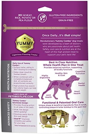 DENTAL TREATS THAT PROVIDE REAL DENTAL CARE – Yummy Combs, daily canine care for teeth, are easy to chew but work like dental floss for a more complete clean than a toothbrush or other chews. Its hardness helps scrub & clean more thoroughly than traditional dental dog treats or dental sticks. See the impact one treat a day can make for your dogโ€™s oral care. Not only will your dog love the yummy flavor but also the feeling of a clean mouth & fresh breath (like dog mints & breath treats).