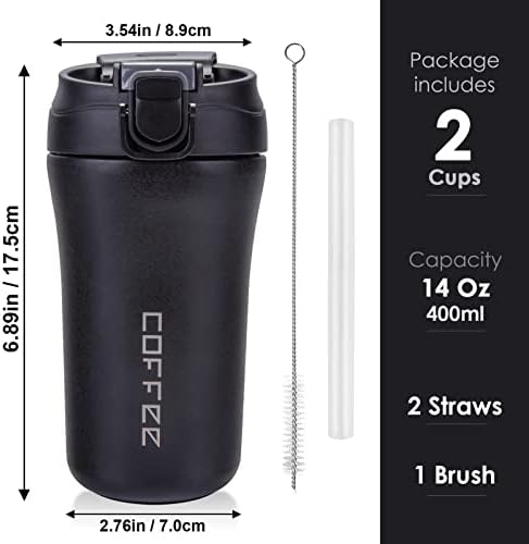 14 oz Travel Coffee Mug, 2 Pack Vacuum Insulated Coffee Travel Mug Spill Proof with Lid and Straw, Reusable Coffee Tumbler for Keep Hot/Ice Coffee,Tea and Beer, Car Thermos Cup Gift for Christmas
