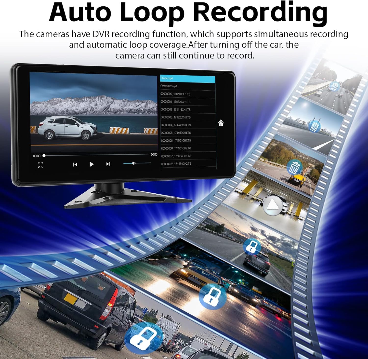 【Reversing Assist&Parking Monitoring】Support the reversing auxiliary line display. Waterproof night vision camera, reversing image is clearer. Automatically switch the reversing image when reversing. Recording will automatically start when an object moves in front of the camera connected to the positive cable of your car’s battery.