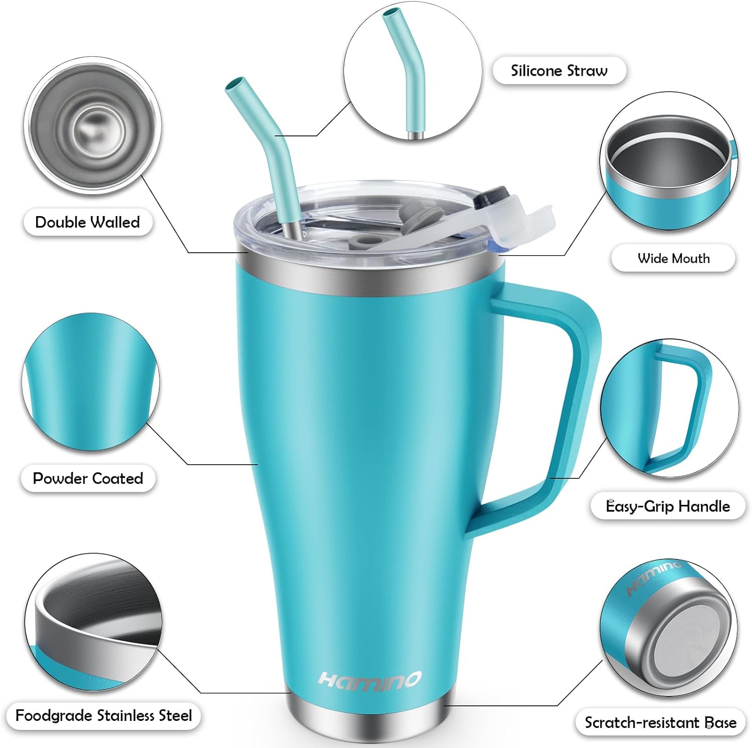 đăCOMFORTABLE COFFEE TUMBLER DESIGNăHamino travel coffee mug is more comfortable to grip. Matte powder coating provides good resistance to scratches and sweat. Durable, no peeling, resists dents and drops. With stainless steel base you wonât need a extra coaster to prevents scratches. Lid with rubber can prevent liquid leakage or the lid from popping open. Wide mouth is easy to clean, fill with large ice cubes or fruit!