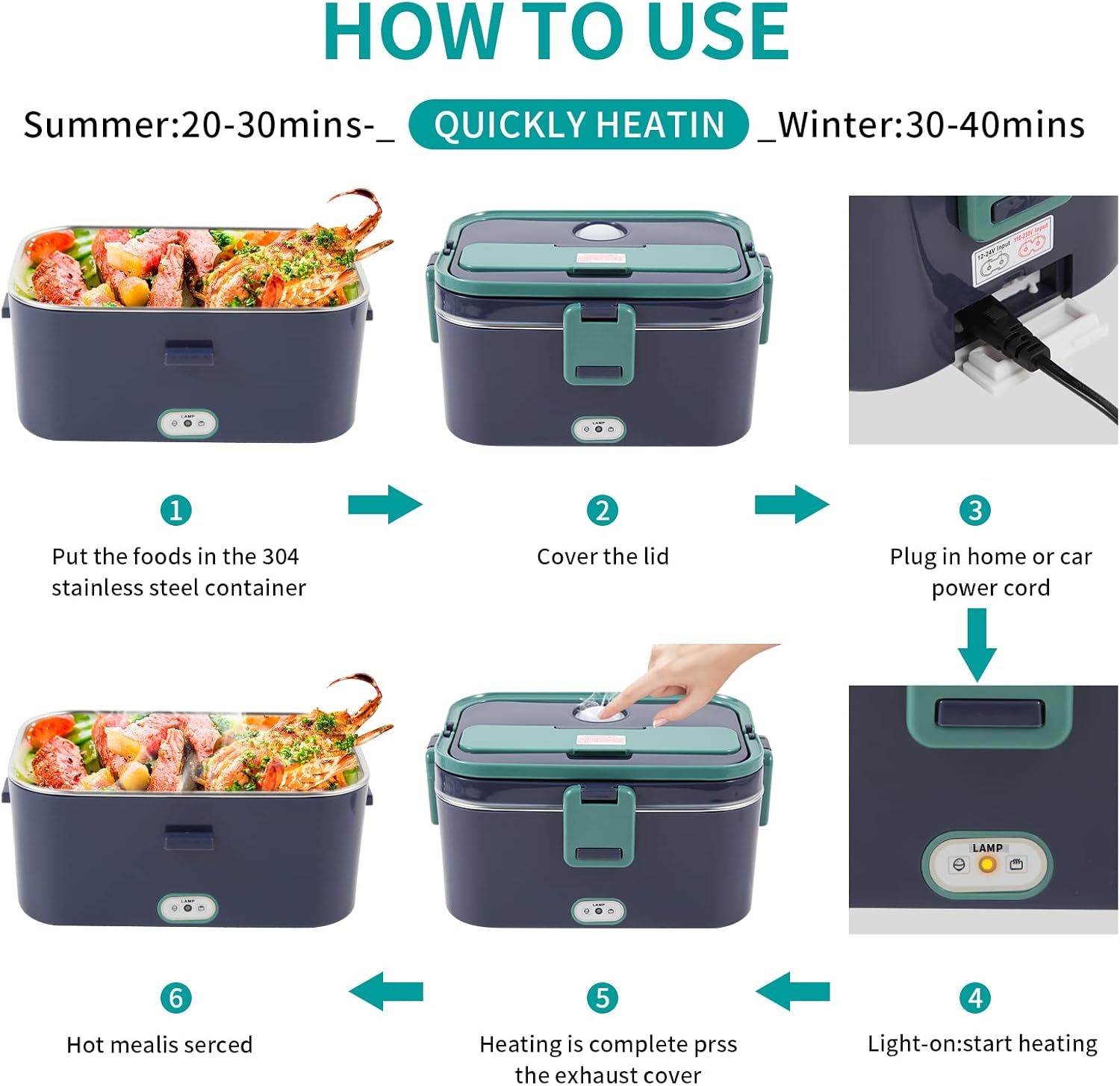 USING GUIDES: 1.Introduce the food into the electric lunch box. 2.Plug the cable. (12V power cord for cars/trucks, 110V for home/office use) 3.lunch box is closed perfectly. 4.Make sure the steam outlet is opened. 5.Please pull out the power cord before eating. 6.Enjoy the meal.