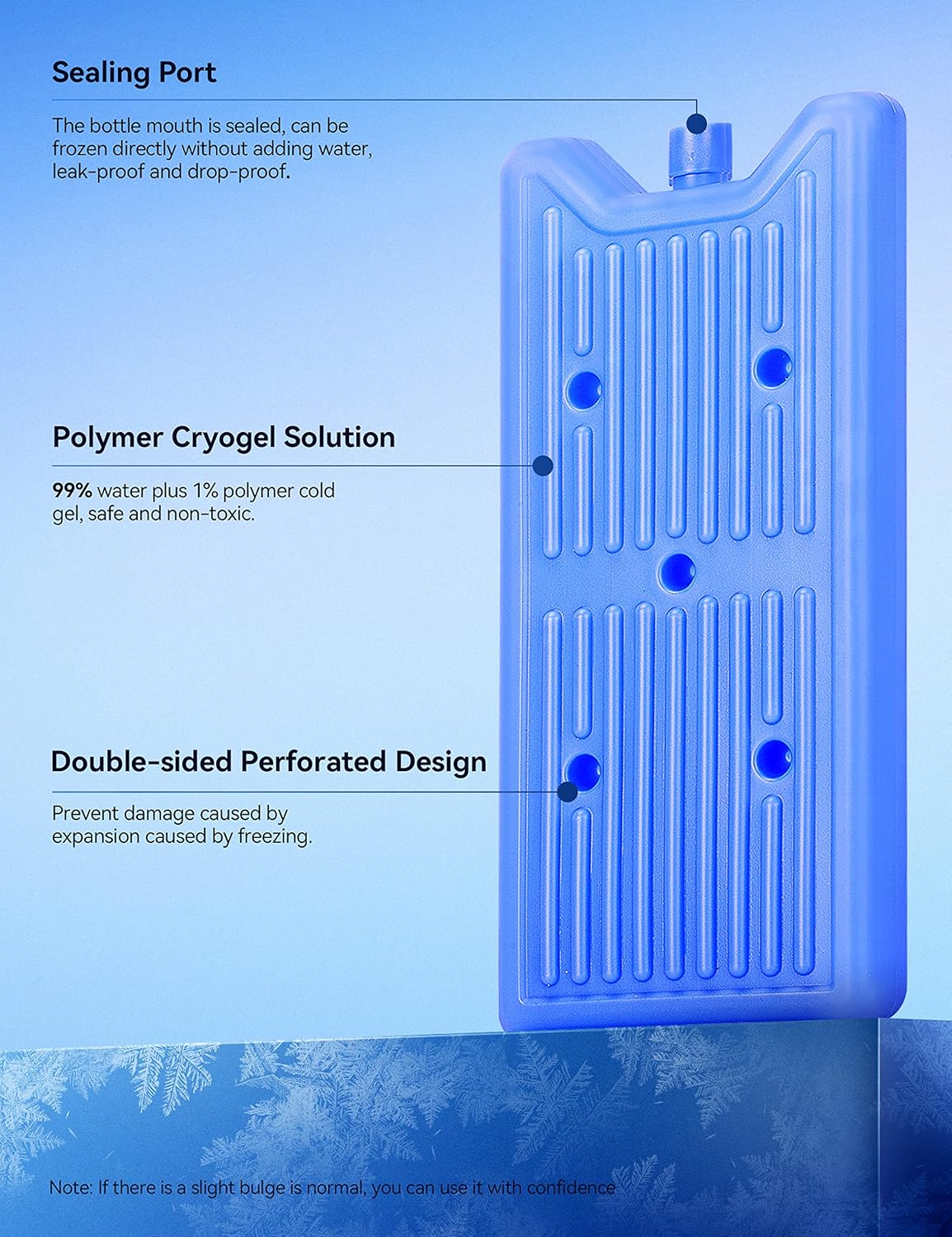 【Safe and Durable】 Our ice packs use a safe and non-toxic gel formula, the bottle mouth is sealed, and can be frozen directly without adding water, leakproof and dropproof, thicker than other brands of shells, and will not deform after freezing