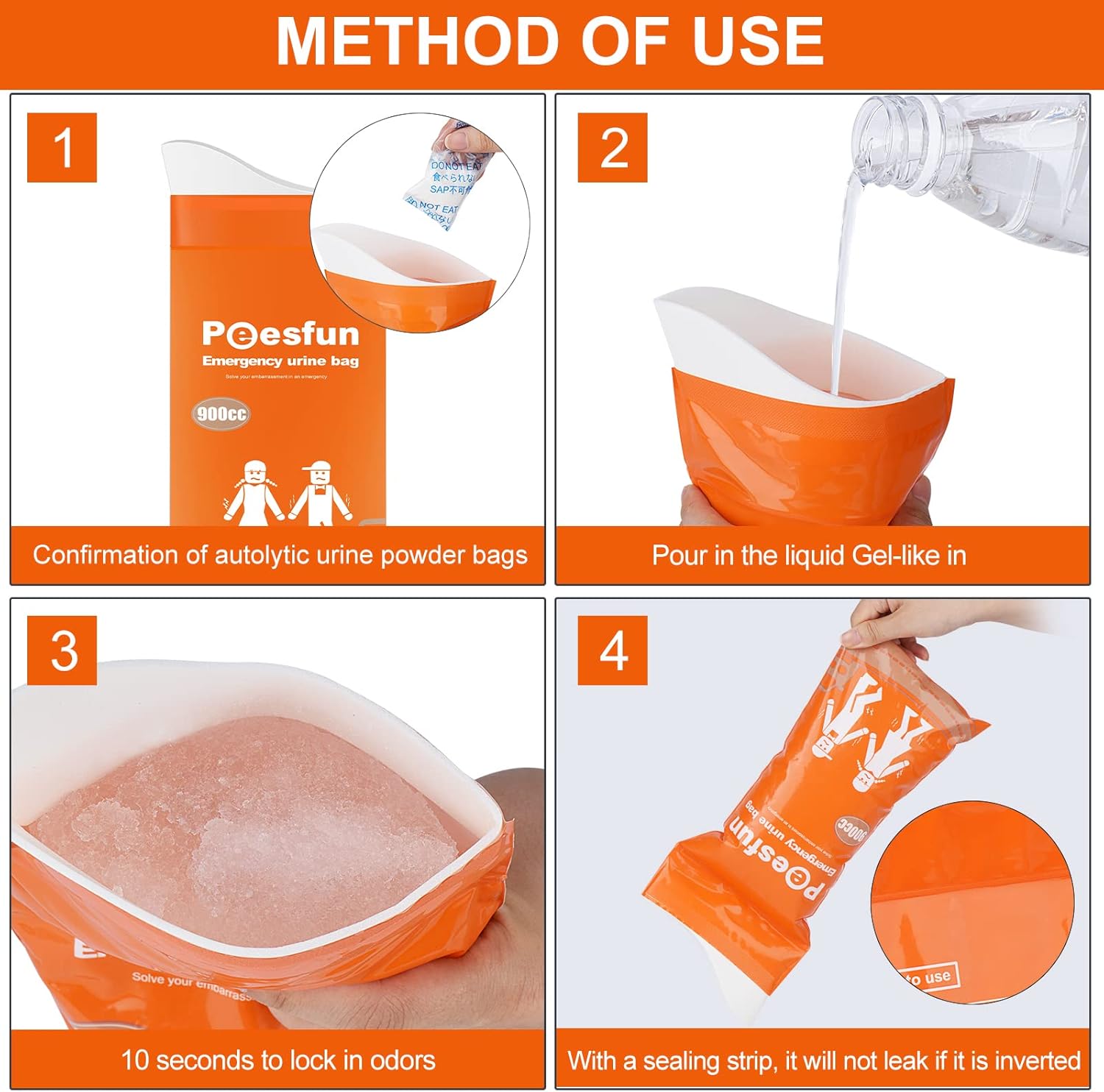 【Easy to Use】Simply open the urine bag to use. Urinal bag contains a small white gel pack (no need to open or empty when in use) that can turn liquid into a gel in 10 seconds, reducing odors and eliminating the need for extra cleaning.