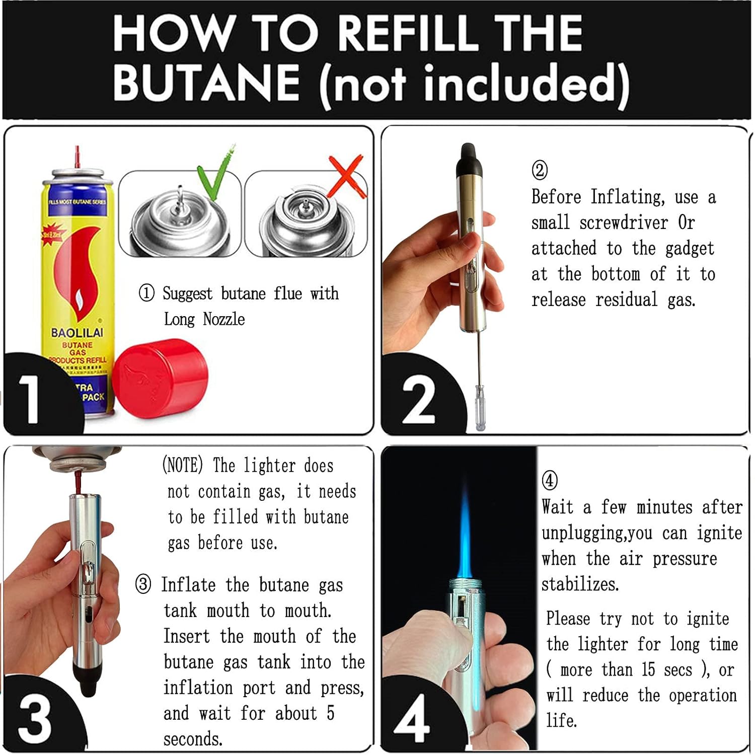 Warning: The Lighter Contains Pressurize Flammable Gas, Keep Your Lighter Out of the Reach of Children. Keep Away from Other Person and Your Own Face and Clothes when Using. Be Sure if the Flame extinguished Completely after Using. Protect from Sunlight and Do not Expose to Temperatures Exceeding 45 Degree.