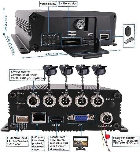 【DELAY RECORDING】: Records footage while vehicle is off – up to 24 hours (draws power from vehicle’s battery).【G-sensor]】Recognizes sudden movements i.e. hard acceleration, sudden stops, speeding and impacts. Can set alerts to to keep these recordings as events.【4-CH ALARM INPUT】: It supports 4-CH alarm inputs, the screen will show full screen of one channel automatically when recieve the trigger signal. Manually create alarms so that associated footage is overwrite protected.