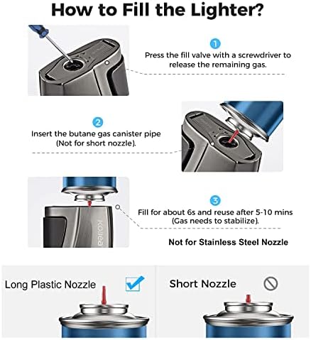 [REFILLABLE & ADJUSTABLE BUTANE LIGHTER] No more disposable cool lighters, just get this refillable torch lighter and choose a butane gas canister with a long plastic nozzle to start your journey at any time (Butane Gas Not Included). Please use a small screwdriver to adjust the flame adjuster as per needs