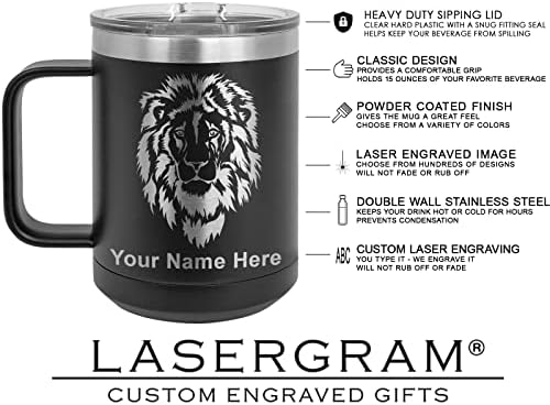 This item is a 15 ounce Travel Coffee Mug that is laser engraved with the image that you see in the photo. Your own personalized text will be laser engraved below the image. The mug is made of stainless steel and features double-walled vacuum insulation with a clear lid. Keeps hot drinks hot and cold drinks cold. Click the “Customize Now” button to begin customizing your mug.