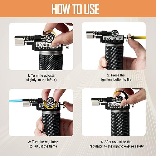 π [Safety & Portable & Durable] RAVS craft torches undergo rigorous 3rd party testing to ensure meet industry safety guidelines. Black diamond cut handle with an ergonomic design, the propane micro torch offers a great grip and stays cool. Long angled nozzle keeps your hand safely away from the flame. The torch lighters built-in Leak-proof Inflation valves. And the cigar lighter torch is made of quality metal material, which is more sturdy and durable than plastic butane torches on the market.