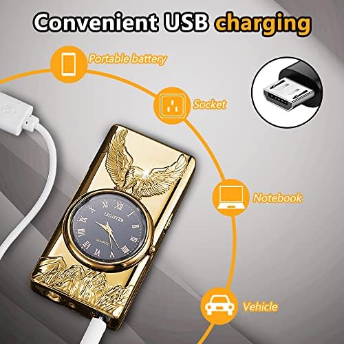 RSBYE Electric Lighter,Dual Arc Plasma Lighter,USB Lighter Rechargeable with Battery Display,Cool Lighter with Clock & Flashlight,Unique Gift for Men and Women (Gold-Eagle)
